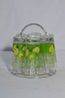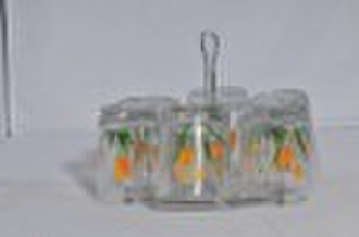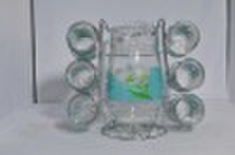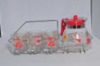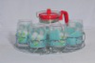 Product Name: Glass Drink Set Item No.: M02-3 Inner Packing: 1 jug+ 6 cups with steel holder in color box Outer Packing: 6sets/ctn Carton size: 59x45.6x28cm Nice Glass Drink Sets,different styles,can do different decals on the glasses. We supply high quality glasses with different sizes,shapes,designs and colors.We can print customer's logo in all the glass and can make any specification as per customer's requirements.Please visit our website to see more designs.